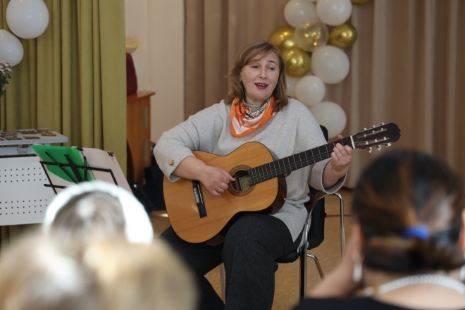 Встречу открыл терапевтический концерт: руководитель клуба Лидия Неживова исполнила под гитару песни с глубоким смыслом о вечных ценностях - дружбе, домашнем очаге, улыбках близких и простом человеческом счастье.