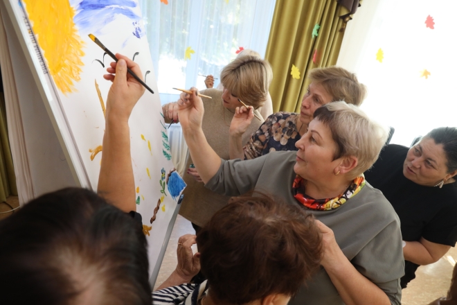 Кроме песен на встрече были использованы арт-терапевтические техники - метафорические карты "Я разрешаю себе" и коллективное рисование осеннего пейзажа. Как итог – полное достижение цели мероприятия. Участники клуба отметили терапевтический эффект концерта.