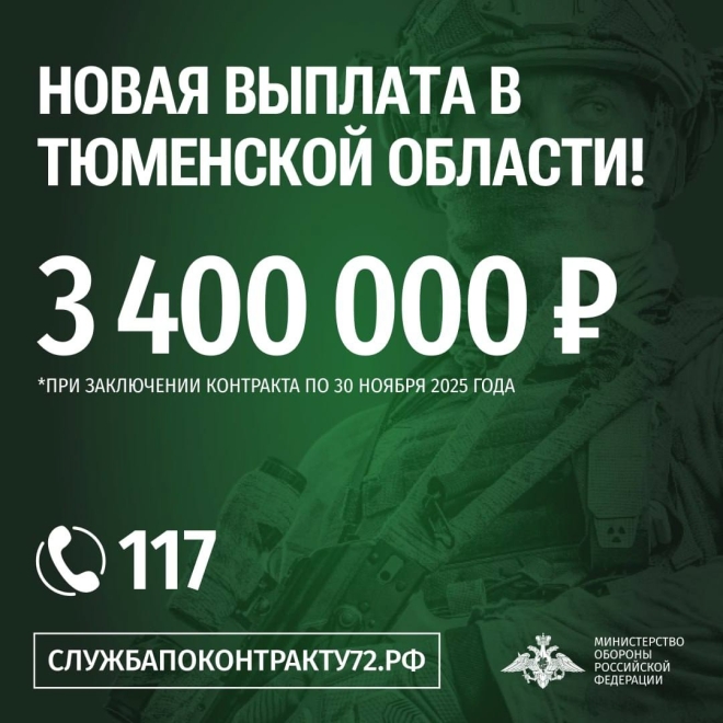 3 400 000 получают граждане, заключившие контракт с Минобороны РФ в военкоматах Тюменской области либо в пункте отбора на военную службу по контракту города Тюмени (ул. Республики, 2/1).