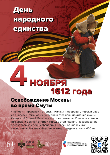 В 1612 году народное ополчение под командованием князя Дмитрия Пожарского освободило Москву от иноземных захватчиков.