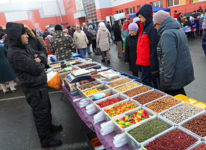 Выбор товаров был огромный: в одном месте можно купить все нужное сразу. Яблоки из Самары, северные ягоды – клюква, брусника, а также кедровые шишки, рыба из соседних районов – щука, сырок, карась, лещ и т.д. Постаралась переработка – прилавки ломились от разных видов колбас и мясных деликатесов. Восточные сладости, орехи, сухофрукты, халва подсолнечная, кунжутная, с семечками, курагой, маком… Легко можно было выбрать и мед: гречишный, липовый, разнотравье, местный, привозной.
