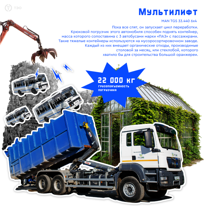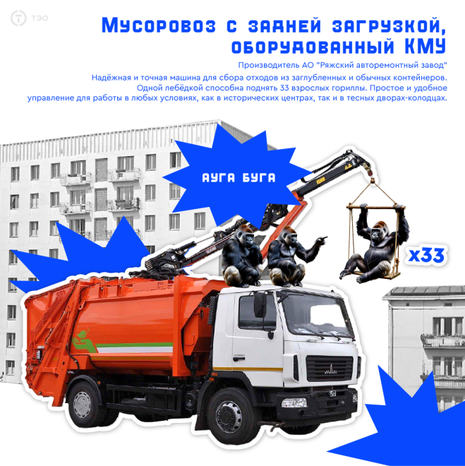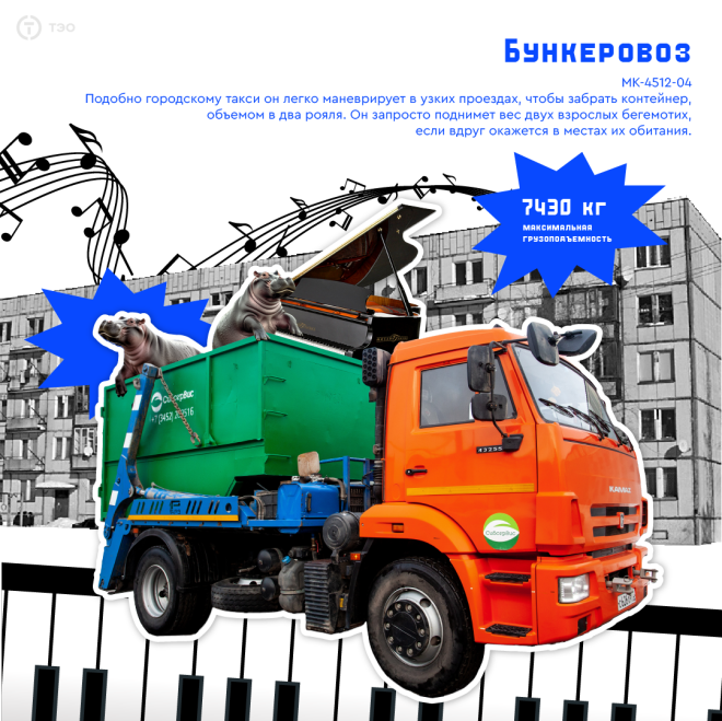 Тюменское экологическое объединение специально для жителей региона подготовило серию материалов, где сложные технические характеристики и возможности автопарка для вывоза отходов представлены в наглядной и увлекательной форме. Чтобы каждый житель, будь то взрослый или ребенок, мог легко вообразить масштабы и возможности современной спецтехники, используются яркие и понятные сравнения.