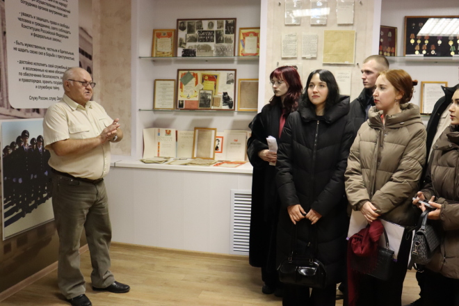 Председатель совета ветеранов МО МВД России "Ишимский" Владимир Широков провёл со студентами экскурсию в музее. Ребята узнали о том, как появились и развивались органы внутренних дел, кто служил в рядах МВД, кто возглавлял ишимский отдел полиции в разные годы. Экскурсанты с интересом знакомились с экспонатами - собранными документами, альбомами с фотографиями.