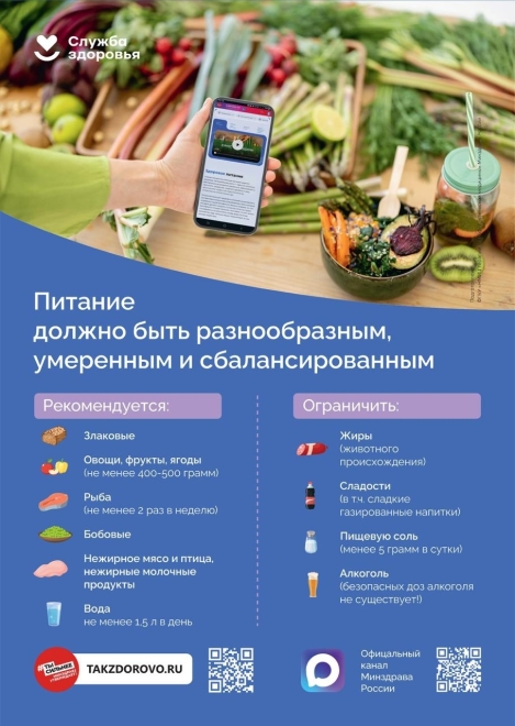 Здоровое питание — это один из лучших способов улучшить своё здоровье. Важно, чтобы еда была разнообразной, не слишком обильной и сбалансированной. Каждый день старайтесь есть злаки, овощи, фрукты и ягоды (не менее 500 граммов), рыбу хотя бы два раза в неделю, бобовые, нежирное мясо и молочные продукты. Пейте достаточно воды — не менее полутора литров в день.