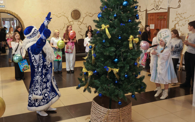 Ученики Детской школы искусств подарили всем гостям чудесные музыкальные номера. А потом в фойе все водили хоровод вместе с Дедом Морозом и Снегурочкой, пели новогодние песни.