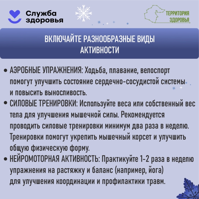 Физическая активность очень важна для нашего здоровья. Она помогает нам чувствовать себя лучше как физически, так и эмоционально. Если вы регулярно занимаетесь спортом, ваше сердце и лёгкие работают лучше, мышцы становятся сильнее, обмен веществ ускоряется, и ваше тело работает более слаженно. Ходьба на свежем воздухе, занятия йогой или просто прогулки тоже полезны: они помогают лучше думать, меньше нервничать и улучшают общее настроение.