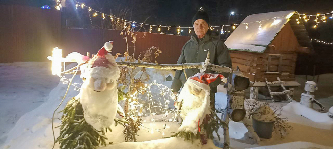Зимой мастерят Геннадий и Алена снежные скульптуры, растягивают сотни метров гирлянд вокруг усадьбы – по карнизам построек, по воротам, палисаднику, вплетают в общую композицию инсталляции из фигурок ангелов, шаров. Получается славно!