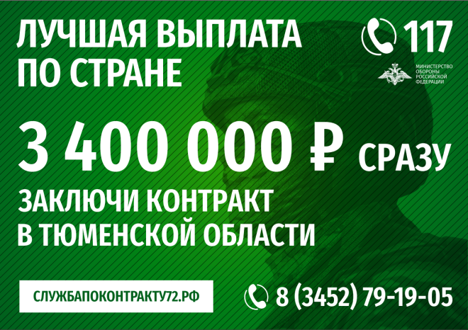 До 28 февраля при заключении контракта с Минобороны РФ именно в военкоматах Тюменской области или в пункте отбора на военную службу по контракту в Тюмени (ул. Республики, 2/1) выплачивается 3 млн 400 тыс. рублей, из них 3 млн – региональная выплата.