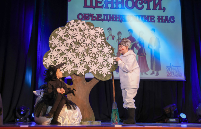 Глубину темы единства народов России дополнили видеоролик "17 ценностей" от Президентского фонда культурных инициатив, сказка северного коренного народа саамы "О ягоде морошке" – о ценности семьи, спектакль "Котенок на снегу" – о ценности дружбы убеждали нас ребята из театральной студии "Чердак" под руководством режиссера Юлии Бачуриной.