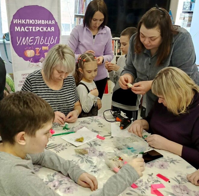 В инклюзивной мастерской "Умельцы" успешной получилась реализация разных направлений и техник: плетения из бумажной лозы, бисероплетения, канзаши (украшение из лент), квиллинга (бумагокручение), поделок из фетра. Участвуя в творческой деятельности, дети вместе со взрослыми прошли путь от интереса к приобретению конкретных навыков и, как надеются организаторы проекта, к профессиональному самоопределению и социальной адаптации.