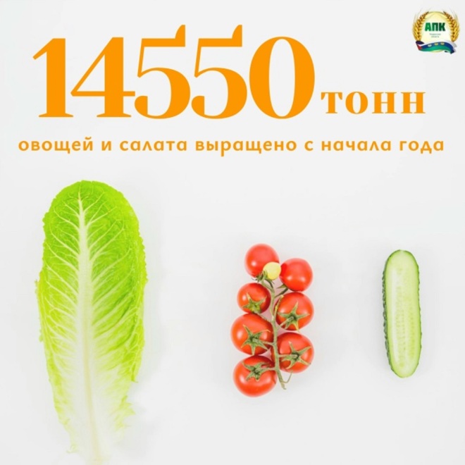 Как сообщает пресс-служба департамента АПК Тюменской области, с начала года в тепличных комплексах собрано 14 550 тонн овощей и салатов. Из них доля огурцов составила 53%, томатов - 45%, салатов - 2%.